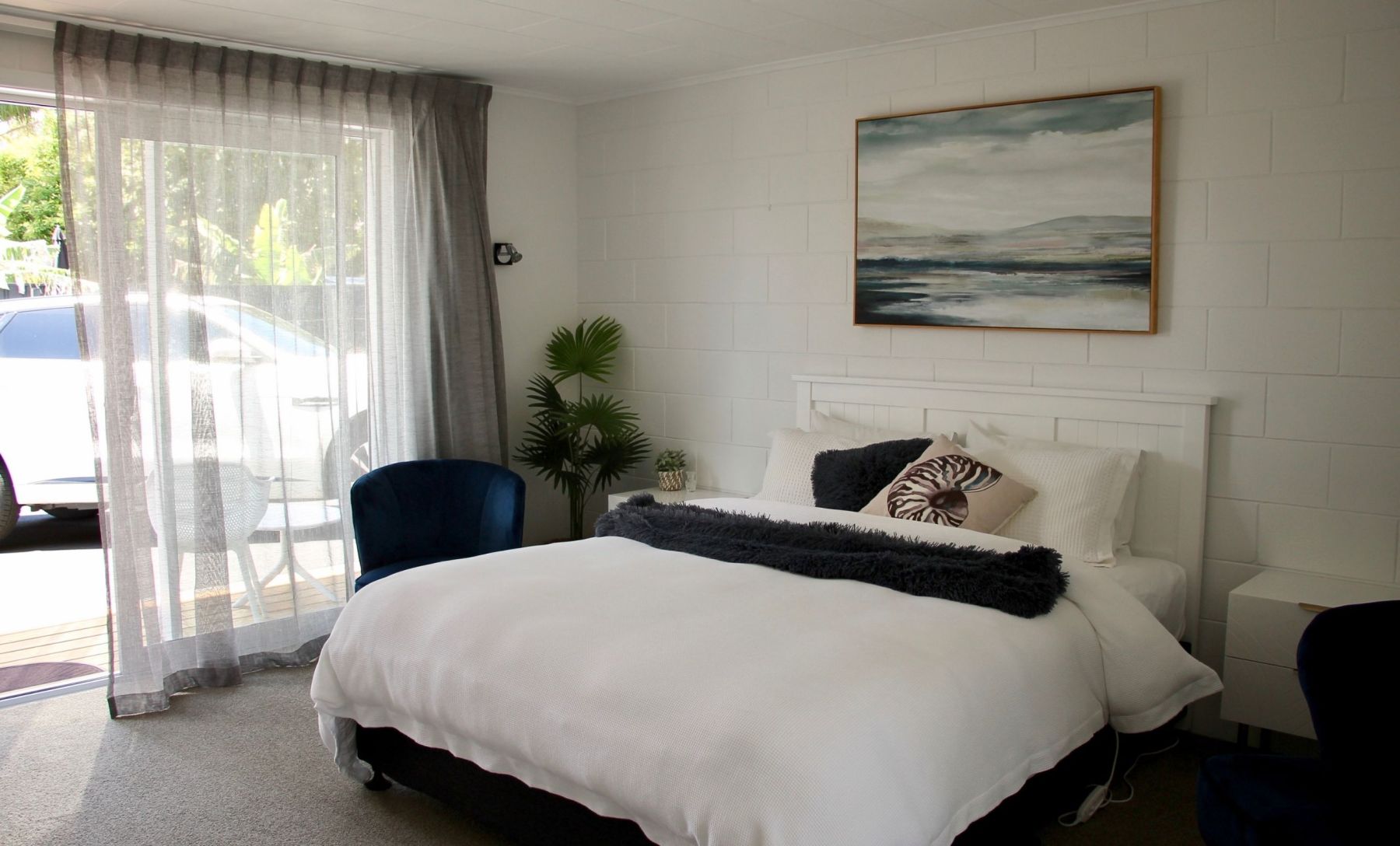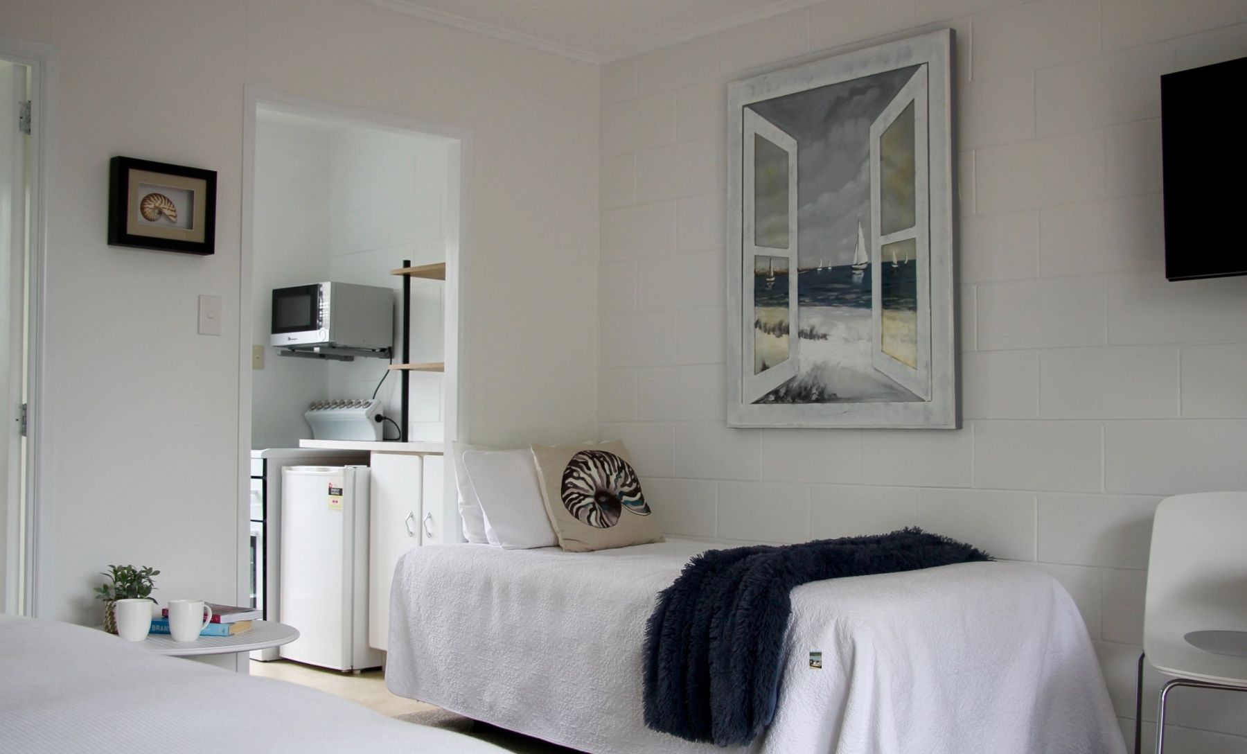 Step into the well-proportioned 30m² Coast Suite, a serene escape adorned in coastal navy and white. Soft sheer curtains and captivating artworks create an ambience of romantic allure. Unwind in a space featuring a King bed and a single bed along with a kitchenette, ensuite bathroom, and a charming deck opening to a colourful garden and parking. Only a delightful 30-second stroll away, find yourself at the waterfront pool and spa area via our tropical boardwalk, where magic awaits!